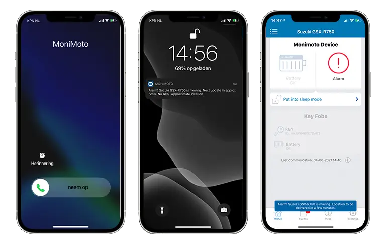 Bij de tests die ik heb gedaan wordt er binnen 1 minuut een melding gedaan door middel van een telefoontje. Je wordt gebeld door MoniMoto. Als je niet opneemt volgt er nog een belletje. Ondertussen worden er ook verschillende push-berichten via de MoniMoto app verstuurd. Deze geven status updates door. Deze meldingen blijven gestuurd worden zolang de motor in beweging is.